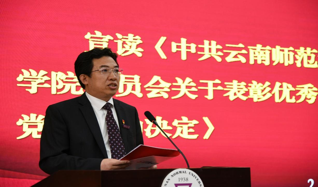 学院党委委员、学院院长王秀成同志宣读了《中共云南师范大学云南华文学院、国际汉语教育学院委员会关于表彰优秀共产党员、优秀党务工作者、先进党支部的决定》。学院有1名党员被表彰为云南省学校优秀共产党员;有5名党员被表彰为学校优秀共产党员、1名党员被表彰为学校优秀党务工作者、2个党支部被表彰为学校先进基层党组织。学院党委表彰了10名优秀共产党员、2名优秀党务工作者、1个先进党支部。