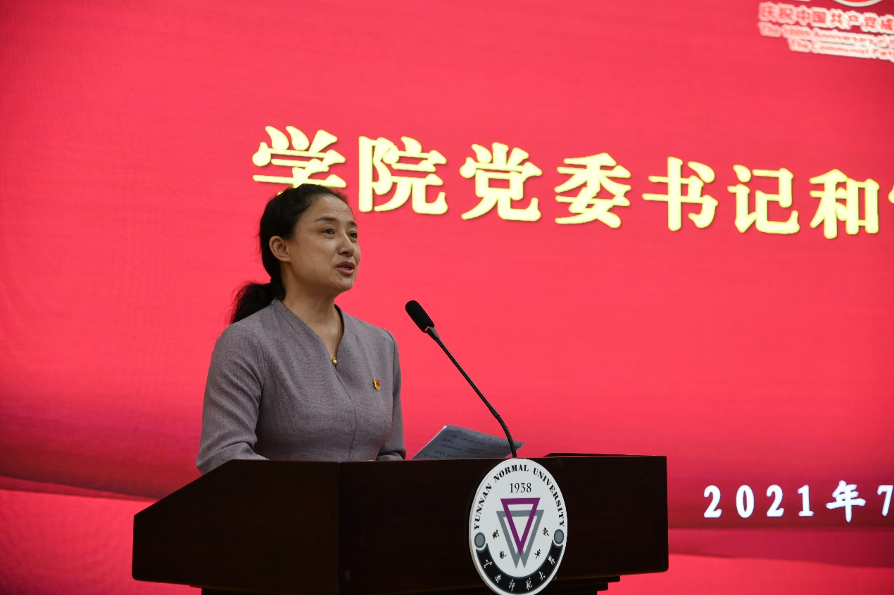 和雪莲书记在讲话中,代表学院党委对全院师生党员提出四点希望:一要坚定政治立场,永葆政治本色。要在思想上做坚定的马克思主义者,自觉做习近平新时代中国特色社会主义思想的坚定信仰者、忠实实践者。大力弘扬西南联大教书救国、读书报国的爱国主义精神,坚持把个人理想同祖国的前途、民族的命运紧紧联系在一起,努力成为有历史感责任感、志存高远的时代新人。二要严守纪律规矩,加强党性修养。认真学习并严格遵守党章党纪党规,严肃党内政治生活,加强党性锻炼。教师党员要带头努力成为“有理想信念、有道德情操、有扎实学识、有仁爱之心”的“四有”好老师,学生党员要带头坚定理想信念,勤学修德、明辨笃实,做到对党忠诚,信念过硬、政治过硬、责任过硬、能力过硬、作风过硬。三要践行党的宗旨,勇于担当作为。要响应党中央号召,牢记初心使命,坚定理想信念,践行党的宗旨,永远保持同人民群众的血肉联系,始终同人民想在一起、干在一起,风雨同舟、同甘共苦,继续为实现人民对美好生活的向往不懈努力,努力为党和人民争取更大的光荣。四要牢记党员身份,发挥先锋模范作用。时刻以党员的标准严格要求自己,经常进行思想政治体检,查找差距,改正不足,永葆先进性纯洁性,在学校学院各项事业的发展中奉献才干、努力奋进,在民族复兴的伟业中为党和人民建功立业。