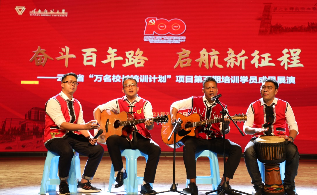 7月12日下午,云南省“万名校长培训计划”第五期“奋斗百年路 启航新征程”学员学习成果展演在昆明理工大学红土会堂举行。项目办全体工作人员及全体参训学员参加了本次展演活动。