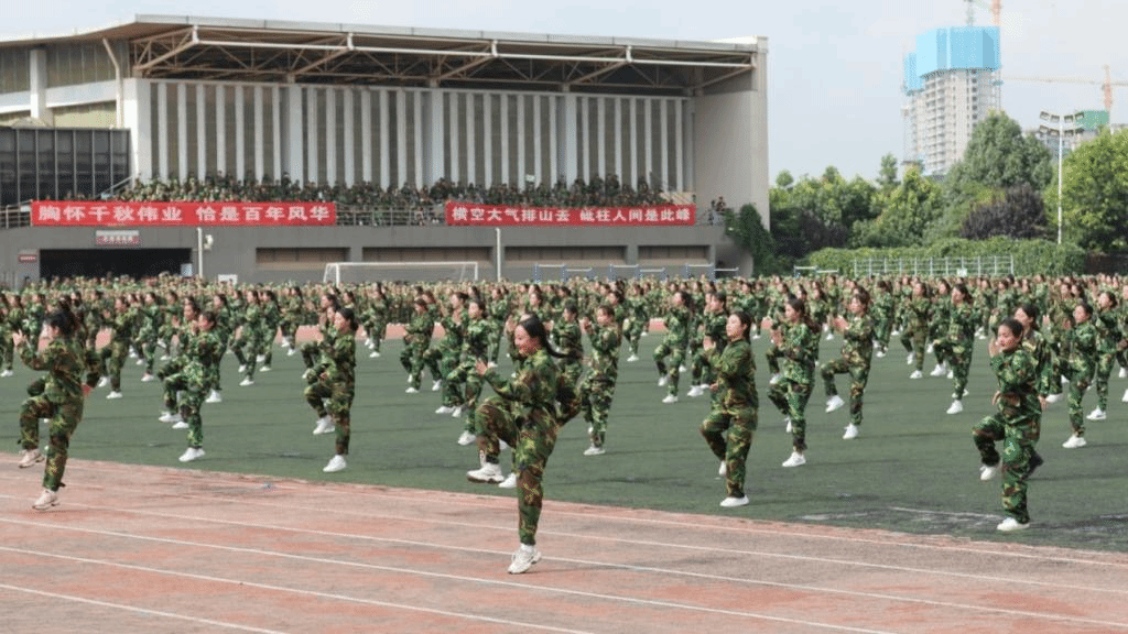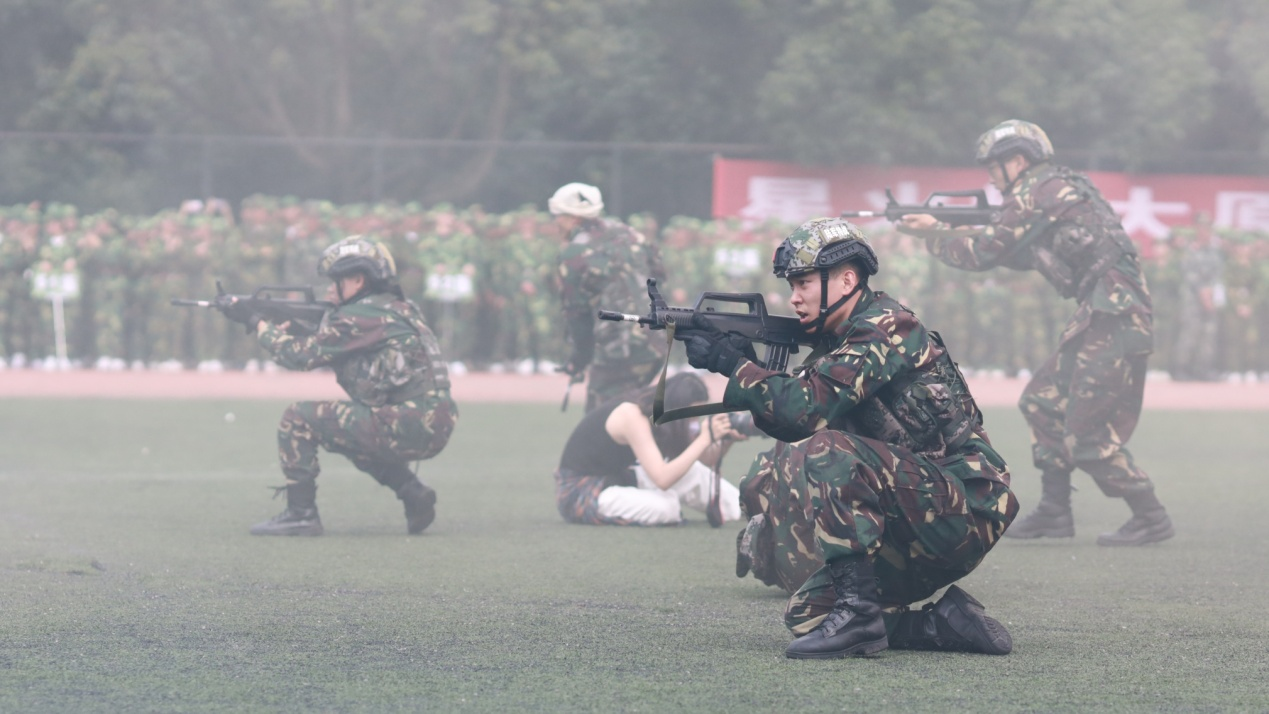 带训教官们以身作则,以国防教育教会学生如何磨练坚韧意志,通过每日披星戴月的军事技能演练,带来了现场震撼人心的军事技能展示,充分展现了中国军人坚韧刚强的意志,赢得了全场热烈的掌声。
