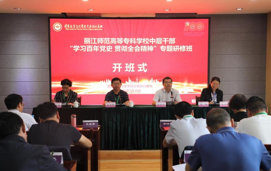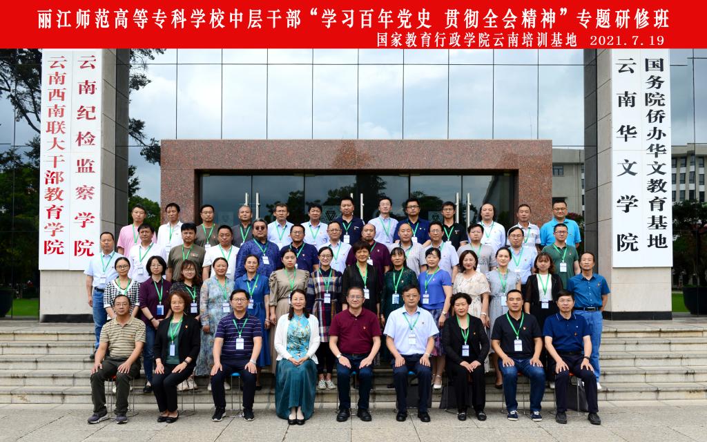 7月18日至22日,丽江师范高等专科学校中层干部“学习百年党史 贯彻全会精神”专题研修班在我校一二一联大校区举办,由国家教育行政学院云南培训基地承办。丽江师范高等专科学校党委书记张祖武、校长毕天云带队,全校中层以上干部共51人参加。丽江师范高等专科学校党委副书记彭鸿昌、副校长朱桂香、云南师范大学副校长牛治亮参加开班仪式,仪式由云南西南联大干部教育学院专职副院长、国家教育行政学院云南培训基地办公室主任匡锦主持。