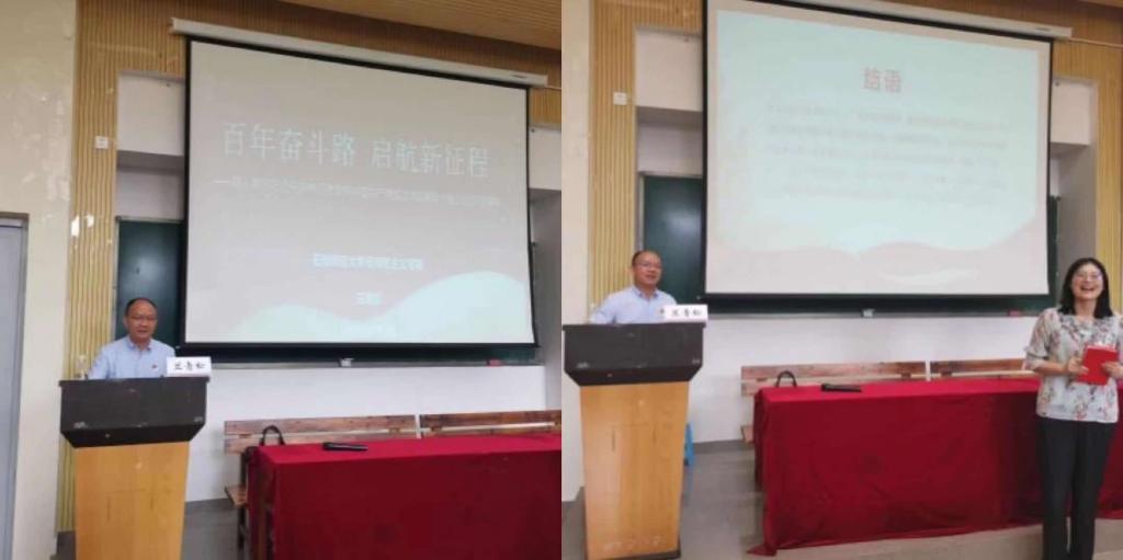 兰青松副教授围绕习近平总书记“七一”重要讲话中的“一个主题”、立足“两个一百年”奋斗目标历史交汇的关键节点、“三个深刻改变”、“四个伟大成就”、“五个庄严宣告”、“九个必须”以及弘扬伟大建党精神等7个方面内容展开宣讲,引导广大师生深刻感悟中国共产党是中国人民最可靠的主心骨,要始终坚持和加强党的全面领导,旗帜鲜明讲政治,不断增强“四个意识”、坚定“四个自信”、做到“两个维护”。
