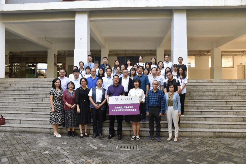 安学斌副校长与昆十中谢晓玲校长共同为“教育硕士专业学位研究生联合培养实践基地”揭牌,全体参会教师与教育硕士实习生合影留念。
