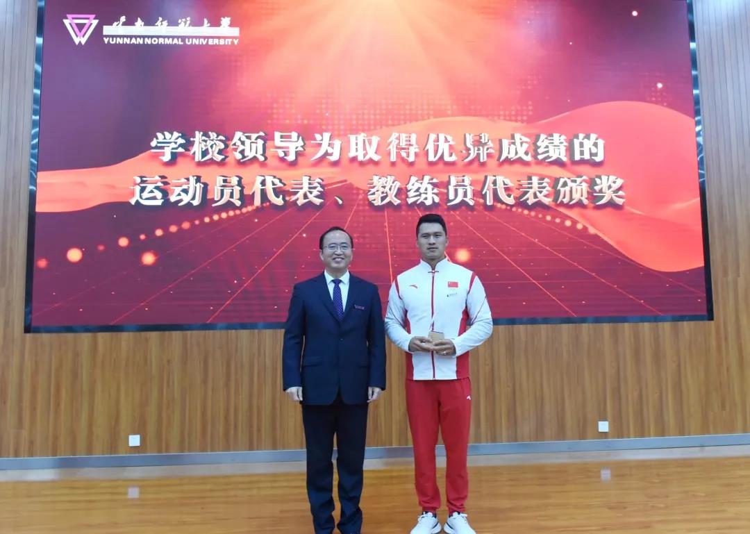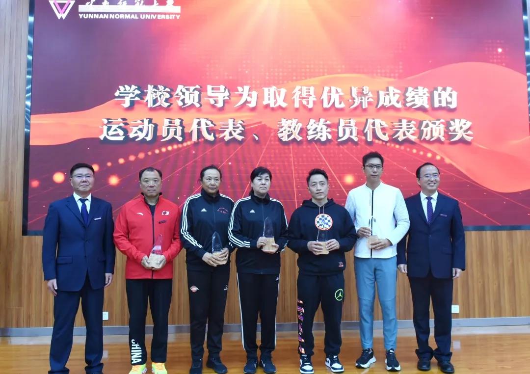 校长王德强致辞,代表学校向参加国际级、国家级体育运动竞赛取得优异成绩的各位运动健儿、教练员和体育工作者表示热烈的祝贺和崇高的敬意。王德强校长指出,党的十八大以来,学校认真贯彻落实习近平总书记关于教育、体育的重要论述和全国教育大会精神,牢记初心使命,不断加强体育教育,努力培养德智体美劳全面发展的社会主义建设者和接班人,为加快建设体育强国贡献力量。一是竞技体育实现重大突破。截至目前,我校运动健儿在奥运会、残奥会等国际级体育竞赛中荣获奖项38项、国家级比赛中荣获奖项293项、省级比赛中荣获奖项706项,我校代表团连续六届蝉联云南省大学生运动会金牌总数和团体总分第一名。二是体育教育事业蓬勃发展。学校紧紧围绕教师教育特色培养体育人才,荣获国家、省级教学成果奖,通过国家、省级一流课程认定,成为西南地区培养基础体育教师、高层次体育科研人才、运动训练人才、体育管理人才和国家级社会体育指导员的重要基地,培养了各类体育专门人才2万余名,赢得了社会广泛赞誉。三是全民健身水平不断提升。学校牢固树立“健康第一”的教育理念,扎实推进全民健身活动,加强校园体育文化建设,办好年度体育节、校级田径运动会,开展千人太极拳、千人啦啦操等活动,全民健身的氛围日益浓厚,“我运动、我健康、我快乐”的运动健康理念在校园蔚然成风。王校长衷心希望云南师大体育在新时代迸发出更加强劲的活力,祝愿中国体育谱写出更加光辉灿烂的篇章。