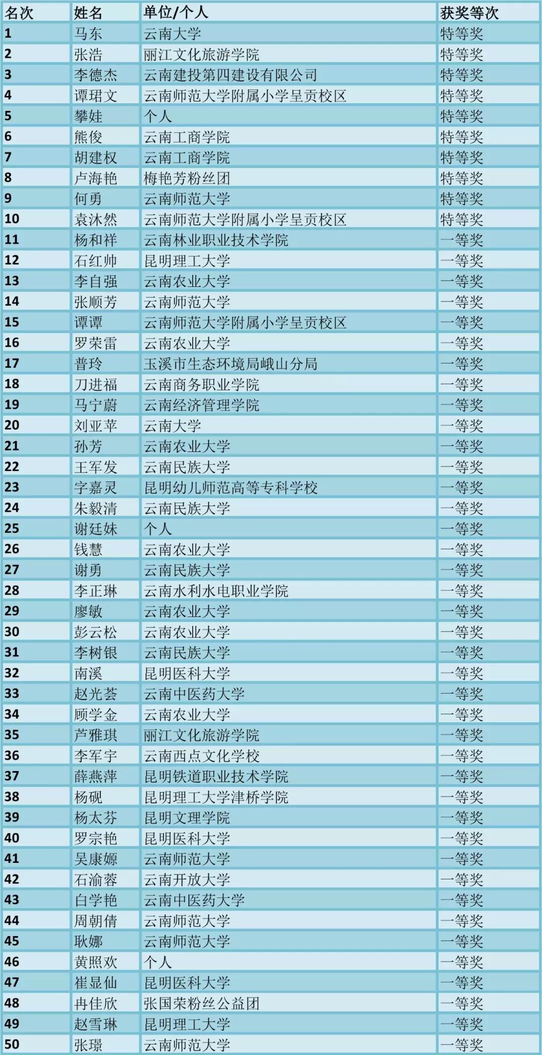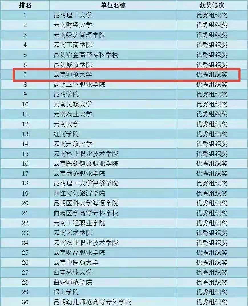 11月4日,由COP15云南省筹备办新闻宣传部、云南省文化和旅游厅、云南省教育厅、云南省生态环境厅、云南省侨联特组织开展的“COP15知识挑战赛”最终获奖名单出炉。我校积极组织师生参加此次挑战赛,荣获优秀组织奖。经过激烈角逐,个人获奖TOP100中,云南师范大学共1人获特等奖,10人获一等奖,获奖人数位居全省第二。