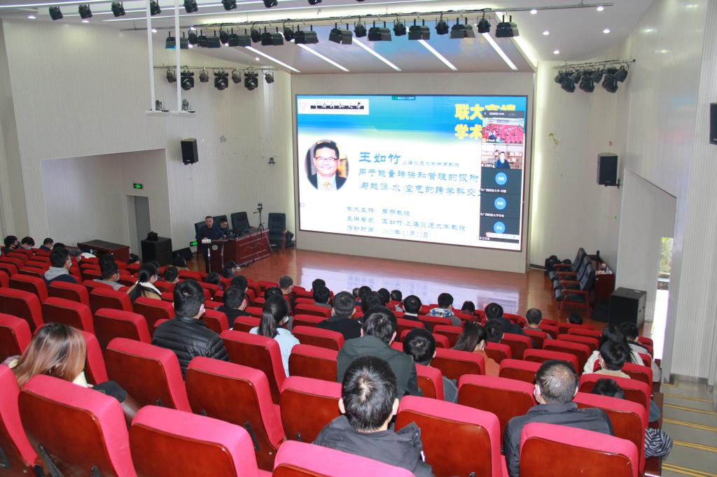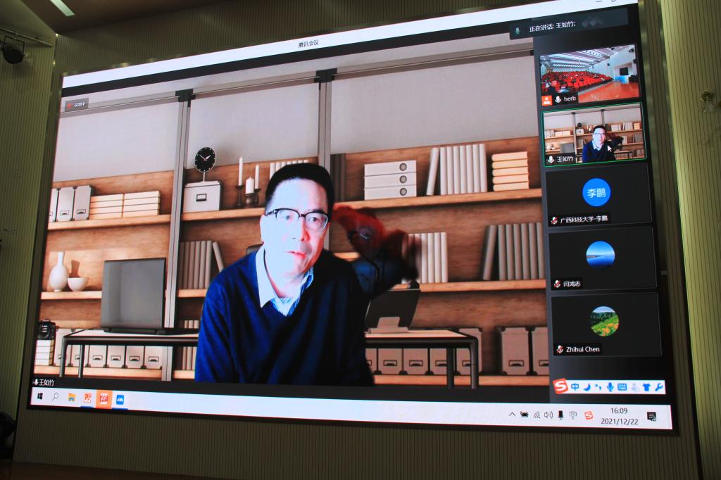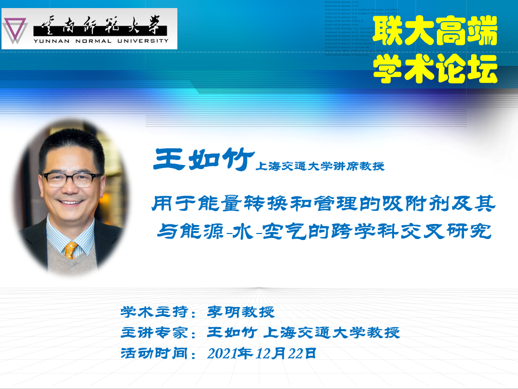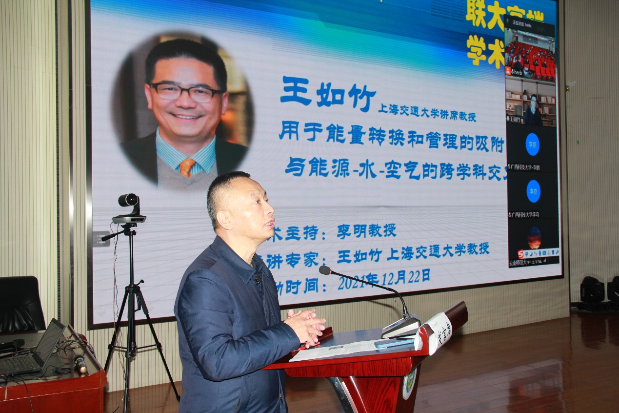 2021年12月22日下午,上海交通大学讲席教授、制冷与低温工程研究所所长、国家基金委创新群体负责人、博士生导师王如竹教授应邀线上出席我校“联大高端学术论坛”,为师生作了主题为“用于能量转换和管理的吸附剂及其与能源-水-空气的跨学科交叉研究”的学术报告,本次线上论坛由云南师范大学科技处处长李明教授主持,能环学院党政领导、科研骨干教师和研究生齐聚能环学院107报告厅聆听了本次报告。