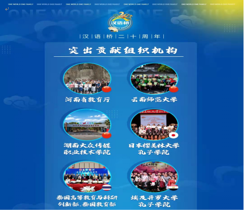 12月20日,由教育部中外语言交流合作中心主办的“汉语桥”20周年庆祝活动举行,此次活动以“汉语为桥,天下一家”为主题,旨在展示“汉语桥”项目实施20年来的丰硕成果。12月24日,官方平台发布“汉语桥”二十周年突出贡献选手、教师、组织机构获奖名单,云南师范大学荣获“‘汉语桥’二十周年突出贡献组织机构”奖。该奖项在国内仅有云南师范大学、河南省教育厅、湖南大众传媒职业技术学院获奖,海外共有日本、泰国、埃及、肯尼亚、英国、俄罗斯、美国、巴西、澳大利亚、新西兰、马来西亚、瑞典、加拿大、哥伦比亚、南非、德国、阿联酋等17个国家的有关教育机构获奖。