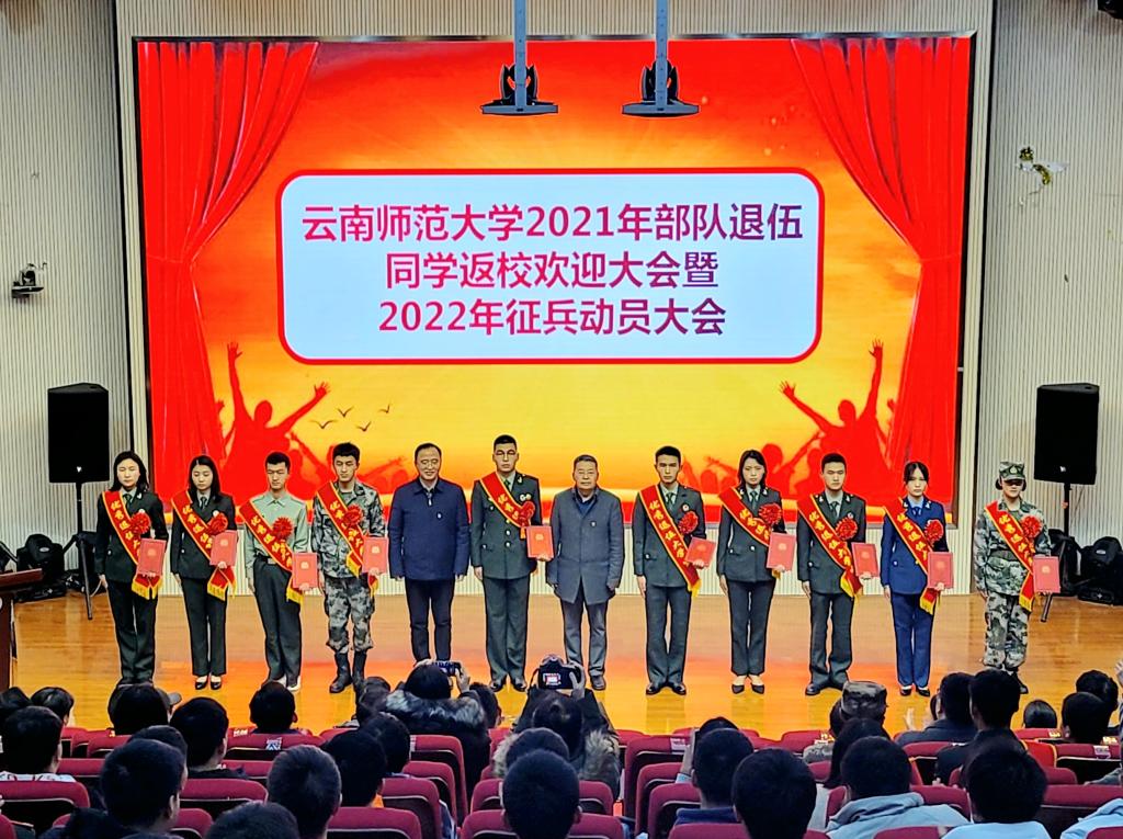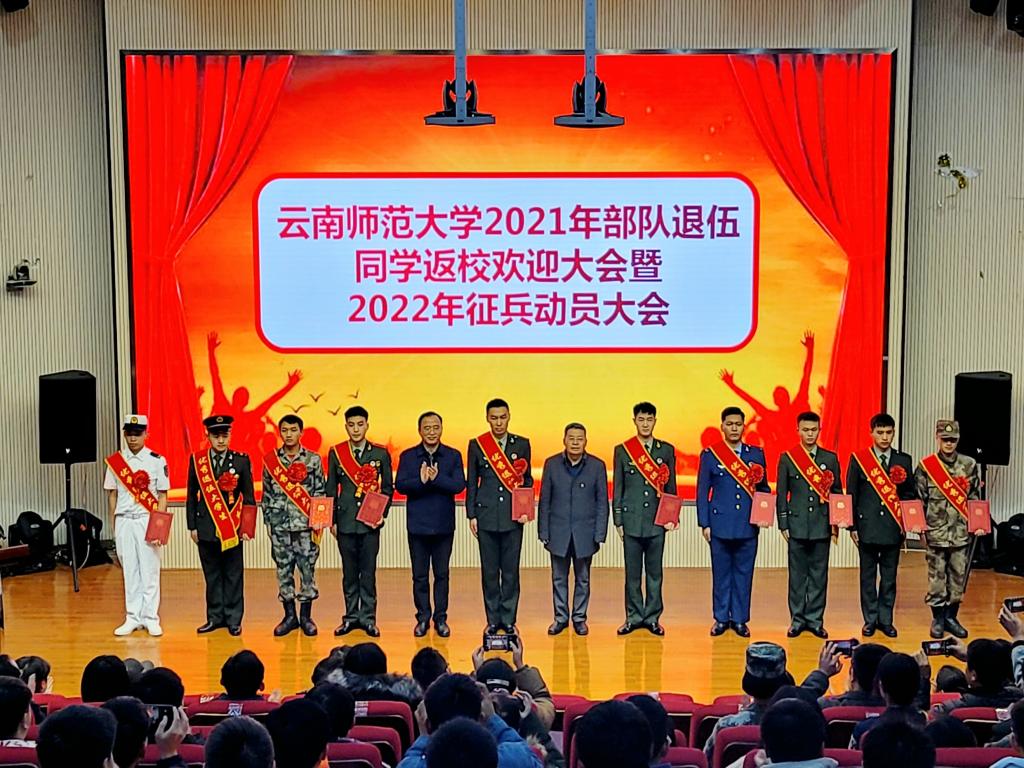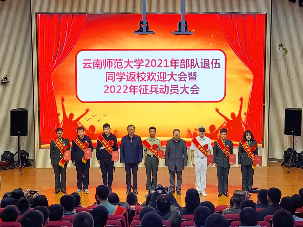 大会在庄严的国歌声中拉开序幕。校领导为退伍复学学生颁发“优秀退伍大学生”荣誉证书,三位退伍学生分享了部队服役经历,蔡金红副校长安排学校2022年征兵工作,蒋永文书记就做好学校国防教育和征兵工作作讲话,并与学院(学部)党委书记签订《云南师范大学2022年征兵目标责任书》。