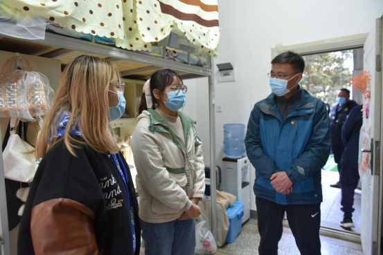 检查组一行先后来到校医院核酸检测点、学生公寓区、食堂、隔离留观宿舍、校门出入口等区域,逐一查看公共场所消杀、学生健康管理、食堂菜品供应、学生购餐、校门进出管理等情况,检查疫情防控工作落实情况,并对薄弱环节进行现场指导。在学生宿舍,王德强校长仔细询问了解学生学习情况以及遇到的实际问题,并叮嘱大家做好自身防护,确保平安健康。