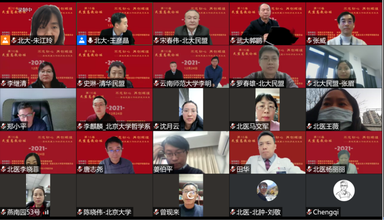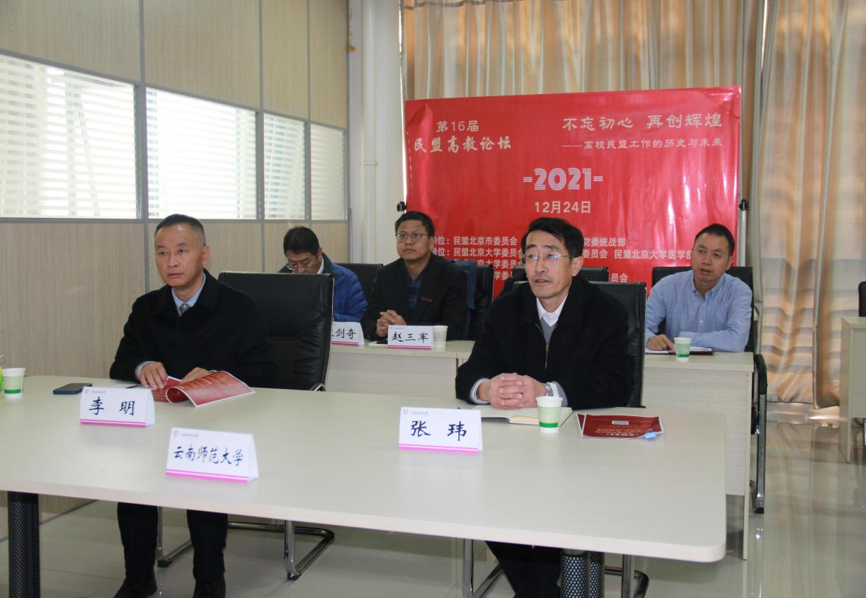 2021年12月24日,由民盟北京大学委员会、民盟清华大学委员会、北京大学医学部委员会“两校三委”主办,民盟北京大学委员会承办,民盟云南师范大学委员会、民盟武汉大学委员会作为特邀单位共同协办的第十六届民盟高教论坛通过线上方式举行。校党委副书记、统战部部长张玮教授、民盟云南师范大学委员会主委李明教授以及云南师大民盟盟员代表、校党委统战部人员参加了论坛。