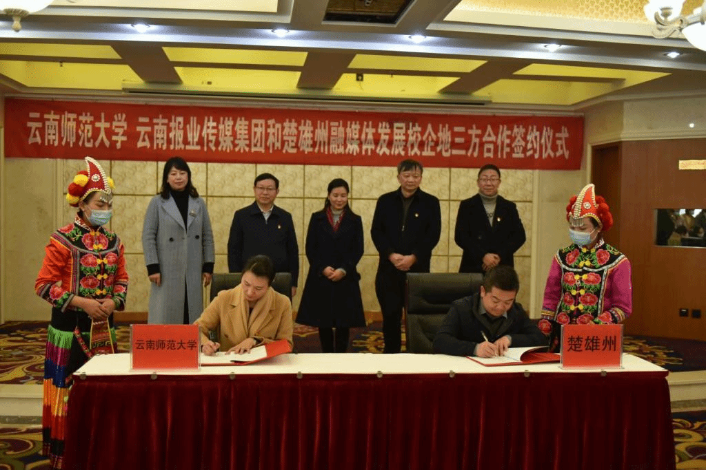 12月27日下午,云南师范大学传媒学院、云南报业传媒集团公司就爱去旅游文化传媒有限公司(以下简称就爱去公司)分别与楚雄州10县(市)签署合作协议。三方将在新闻传播、人才培养、技术培训、流程再造、平台拓展、品牌宣传、文旅融合、产媒融合、文化旅游及高原特色产品宣传营销等方面开展全方位合作,合力创新实践“新闻+政务服务商务”的融媒体发展模式,以 “校企地一体化”创新驱动媒体融合发展。