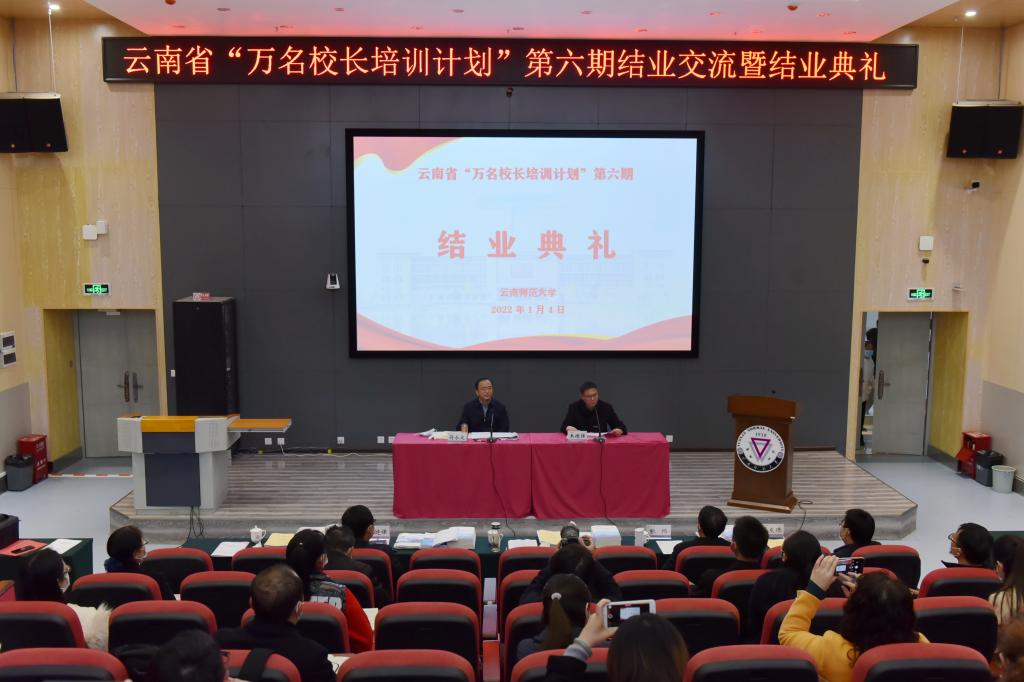 1月4日上午,云南省“万名校长培训计划”第六期结业交流暨结业典礼在我校国家教师教育教学实验中心报告厅举行。为落实疫情防控要求,结业典礼采取线上线下结合的方式进行,设省教育厅会场、云南师范大学国家教师教育教学实验中心会场以及20个培训班教室分会场。参加结业交流暨结业典礼的有:省教育厅党组成员、副厅长曾继贤,省教育厅教师工作处处长雷韬;我校党委书记蒋永文,党委副书记、校长王德强,党委副书记张玮,副校长武友德、甘健侯;“万名校长培训计划”第六期全体参训学员、项目办全体工作人员。