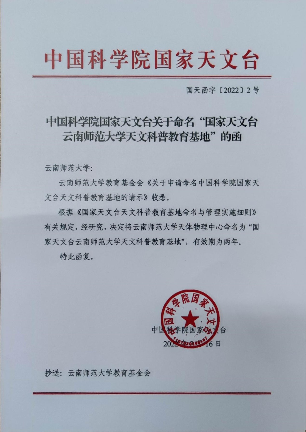 中国科学院国家天文台根据《国家天文台天文科普教育基地命名与管理实施细则》有关规定,于2022年1月12日在中国科学院国家天文台官方网站公布了《关于命名国家天文台云南师范大学天文科普教育基地的公示》。公示结束后,于2022年2月16日决定将云南师范大学天体物理中心命名为“国家天文台云南师范大学天文科普教育基地”,有效期为两年。