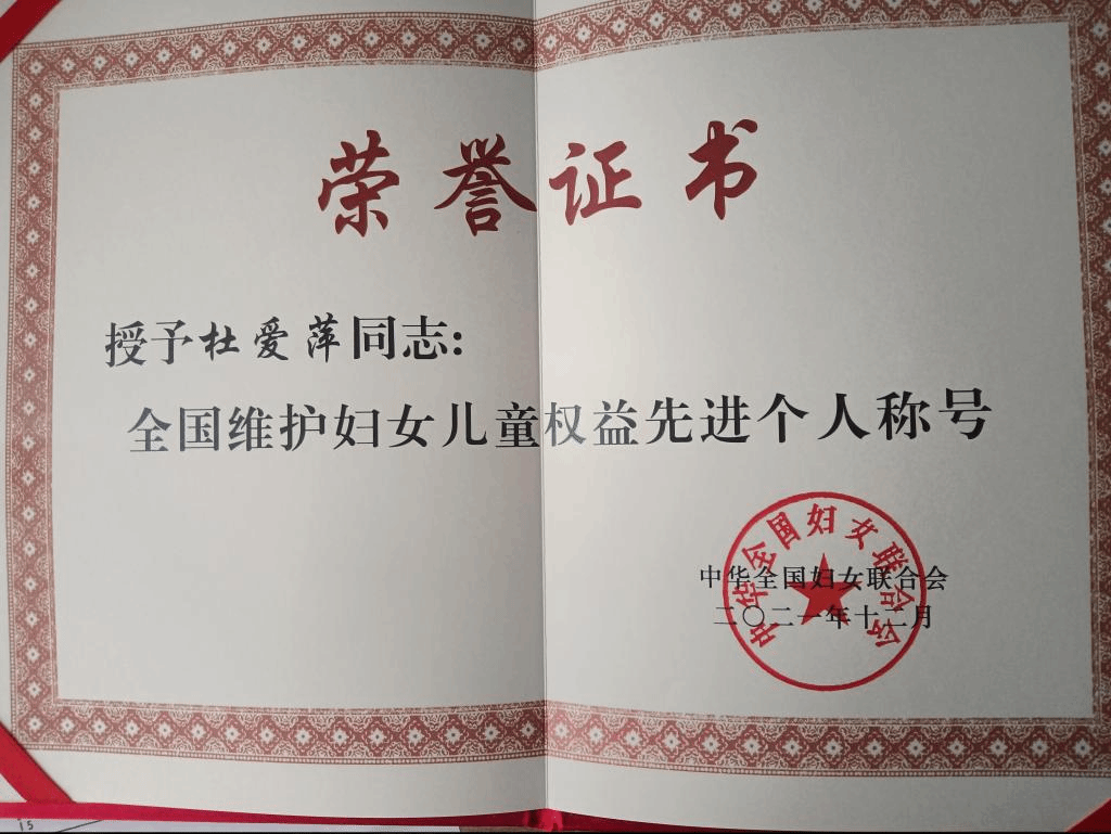 为表扬先进、树立榜样,弘扬社会主义法治精神和社会主义核心价值观,推动妇女儿童权益保护工作,2021年全国妇联决定授予796个单位全国维护妇女儿童权益先进集体称号,授予798名同志全国维护妇女儿童权益先进个人称号。全国维护妇女儿童权益先进表彰项目每两年举办一次,本次全国妇联表彰了全国在维护妇女儿童权益方面表现突出的单位和个人,主要来自基层公检法司、教育、民政、工青妇等人民团体。他们在平时的工作中,爱岗敬业,在维护妇女儿童权益方面作出了突出贡献。我校法学与社会学学院杜爱萍喜获“全国维护妇女儿童权益先进个人”殊荣。