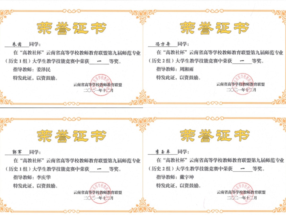近日,“高教社杯”云南省高等学校教师教育联盟第九届师范专业大学生教学技能竞赛结果揭晓,在备赛小组全体师生的共同努力下,历史与行政学院师生包揽了本次历史学科教学技能竞赛全部一等奖。“高教社杯”云南省高等学校教师教育联盟师范专业(历史学科)大学生教学技能竞赛时隔五年后再次举办。继2016年联盟教学斩获全部一等奖(4项)之后,我校学生再次将全部一等奖(4项)收入囊中,同时还获得2项二等奖,1项三等奖。