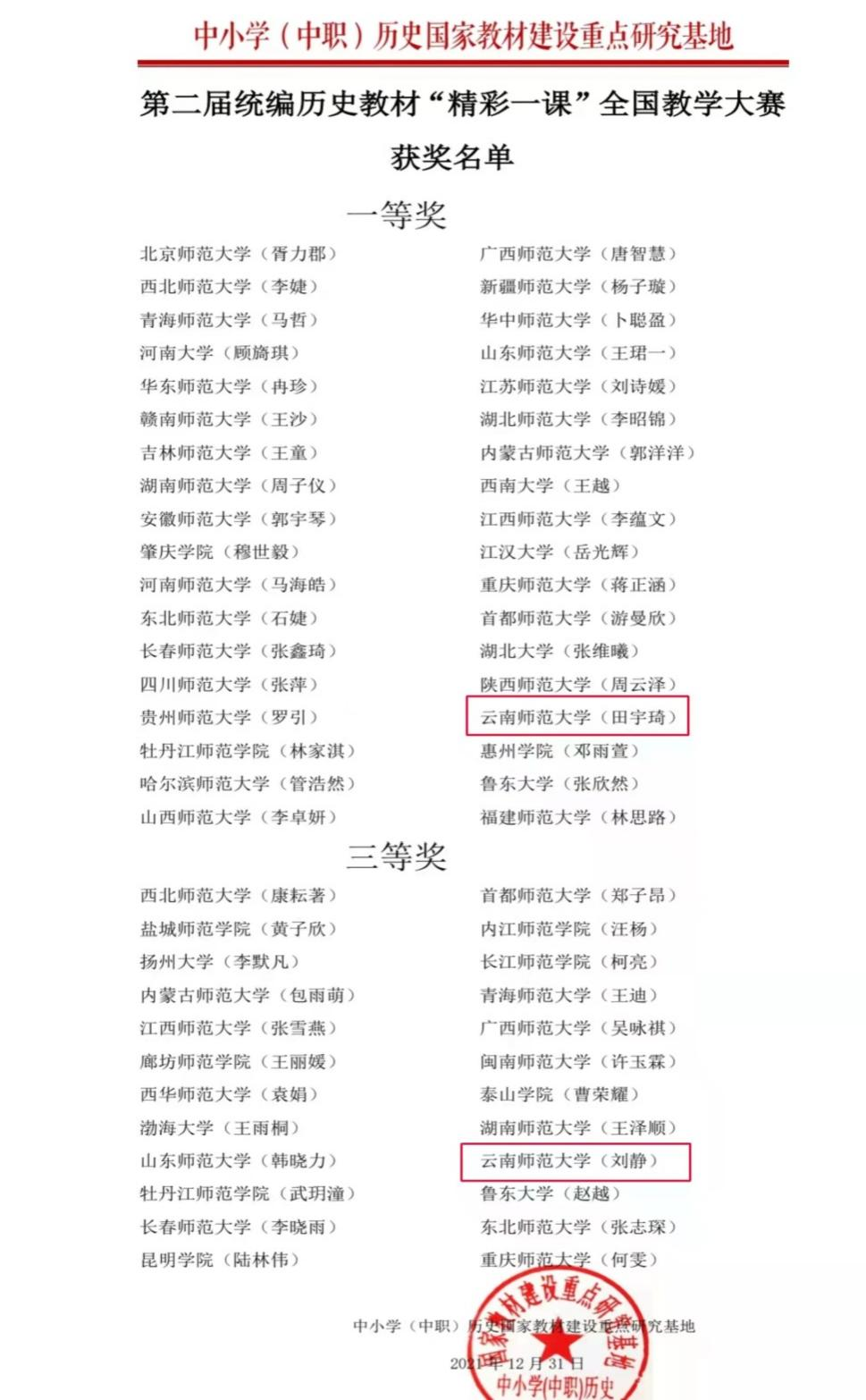 近日,由中小学历史国家教材建设重点研究基地主办,福建师范大学承办的第二届统编历史教材“精彩一课”全国教学大赛成绩揭晓。经过紧张激烈角逐,历史与行政学院田宇琦同学荣获一等奖,刘静同学荣获三等奖,姜泽民、颜艳娟、李庆华、周湘雨四位老师荣获“优秀指导教师奖”。