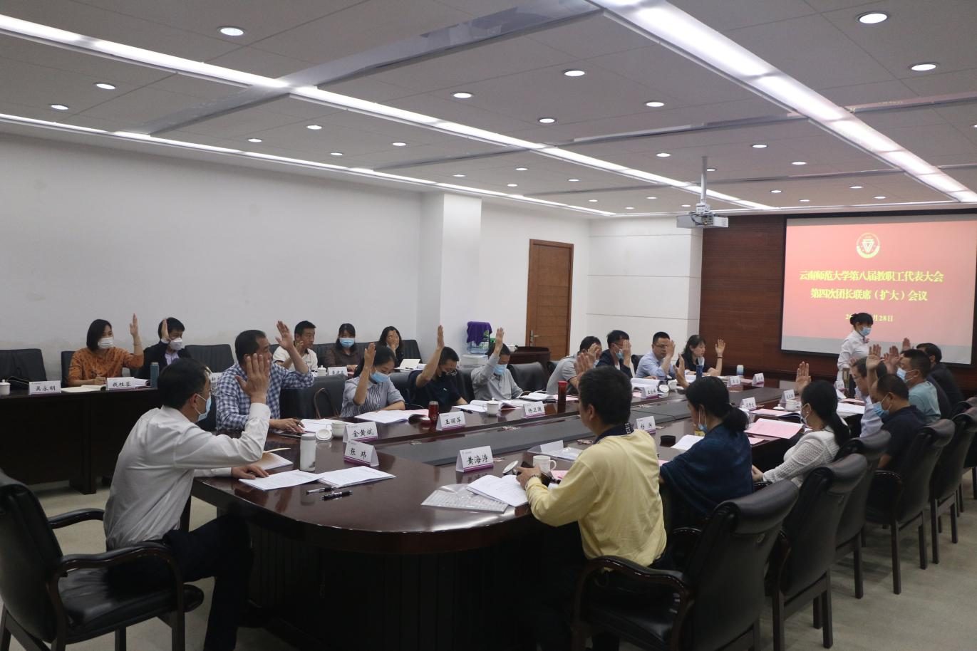 会议听取了学校章程修订工作领导小组办公室关于学校章程修订的背景、修订的过程、修订的内容、下一阶段工作安排四个方面的说明和汇报;与会人员对《云南师范大学章程(修订草案)》进行了认真讨论和审议;会议通过举手表决的方式,一致通过了学校第八届教代会第四次代表团团长联席(扩大)会议关于《云南师范大学章程(修订草案)》的决议。