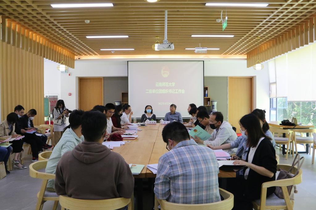 为深入学习贯彻习近平新时代中国特色社会主义思想,加强工作交流与学习,总结阶段性工作,部署近期重点工作,云南师范大学二级单位团组织书记工作会议于2022年4月29日下午在华文国语学院同析2号楼教职工活动室召开。校党委副书记李宏,华文国语学院党委书记和雪莲、副书记常数,校团委全体人员,各学院(学部)团委书记参加会议。会议由校团委副书记曹逸凡主持。