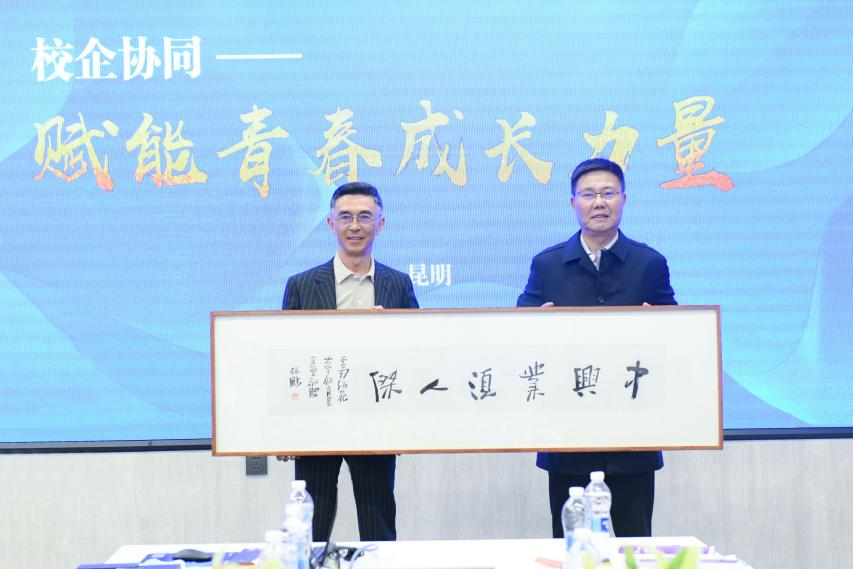 座谈最后,王德强校长向颜语董事长赠予书法匾额——西南联大校歌歌词“中兴业,须人杰”。西南联大谱写了苦难中的辉煌,中华民族的中兴大业需要更多的杰出人才,愿新时期的新青年们在学校和企业的共同关心帮助下肩负起时代新使命。
