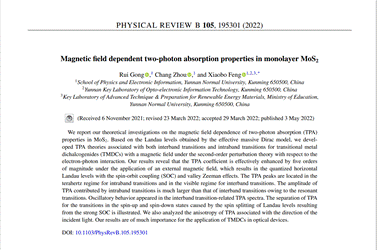近日,我校物理与电子信息学院新型光电材料与器件科研创新团队在单层二硫化钼材料双光子吸收效应的磁场调控方面取得研究进展,其研究成果《Magnetic field dependent two-photon absorption properties in monolayer MoS2》在物理学国际著名学术期刊Physical Review B上发表。云南师范大学物理与电子信息学院硕士研究生龚蕊为论文第一作者,冯小波教授为通讯作者。