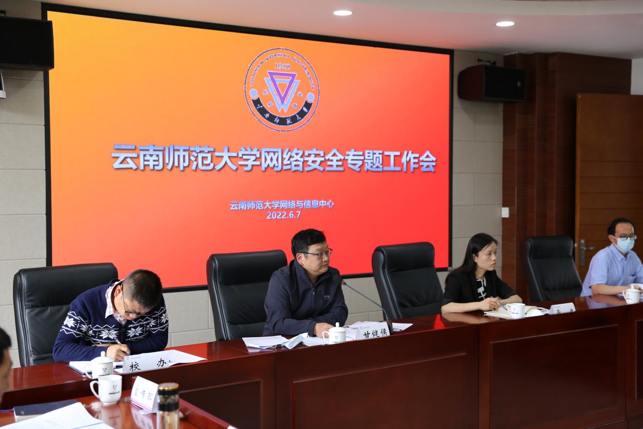 为贯彻落实党中央和习近平总书记关于网络安全工作的重要指示精神和决策部署,深入落实网络安全责任,全力做好党的二十大、联合国《生物多样性公约》第十五次缔约方大会(以下简称COP15)第二阶段会议等重大活动网络安全保障,根据云南省委省政府、教育厅和公安厅关于网络安全工作的部署,进一步加强我校网络安全管理工作,2022年6月7日,甘健侯副校长在呈贡校区主持召开了云南师范大学2022年网络安全专题工作会,各部门(学部、学院)领导和网络管理员参加了会议。