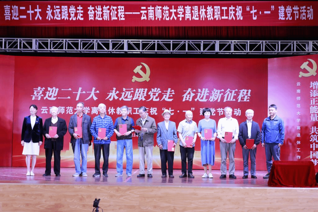 随后,离退休工作处处长郭培元宣读了获得中共中央“光荣在党50年”纪念章党员名单。张玮副书记及相关单位负责人为获得中共中央“光荣在党50年”纪念章的每一位党员颁发了纪念章。老党员雷声同志朗诵本人新创的诗作《重温入党誓词》。接着,离退休工作处处长郭培元宣读了在学校离退休教职工“喜迎二十大,永远跟党走,奋进新征程”文学艺术作品征集评审活动中获奖的老同志名单,离退休工作领导小组成员单位及联大校区相关单位负责人等为获得表彰的离退休教职工颁发了荣誉证书,第一阶段在《国际歌》中圆满结束。