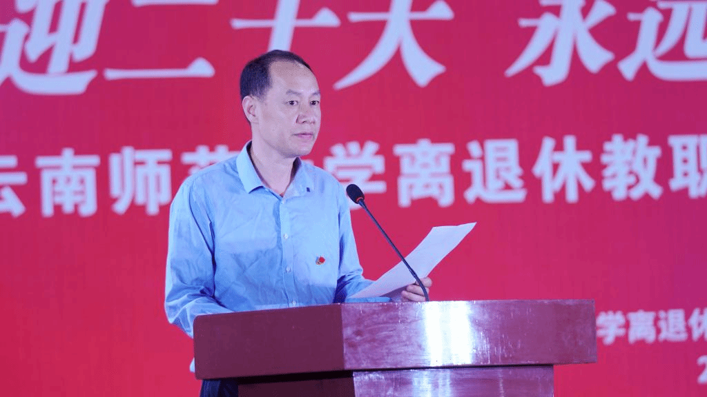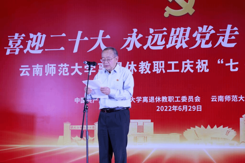 会上,校党委副书记张玮致辞,他首先向获得中共中央“光荣在党50年”纪念章的离退休教工党员致以崇高的敬意和诚挚的祝贺,向学校全体离退休教职工致以诚挚的问候。张副书记指出,各位老党员长期受党的教育,理想信念坚定,思想政治觉悟高,领导经验丰富,学科专业底蕴深厚,服务师生能力强,培养人才水平高,是学校发展的巨大资源宝库和重要支柱力量。希望广大离退休党员牢记初心使命,永葆政治本色,继续发挥政治优势、经验优势和威望优势,一如既往地关心支持学校各项事业发展,带头为广大青年党员、干部师生讲好党的故事、革命的故事、英雄的故事,使党的好传统、好作风发扬光大、代代相传,把西南联大爱国精神、刚毅坚卓的校训品格和云南师大的优良传统传承好、弘扬好。