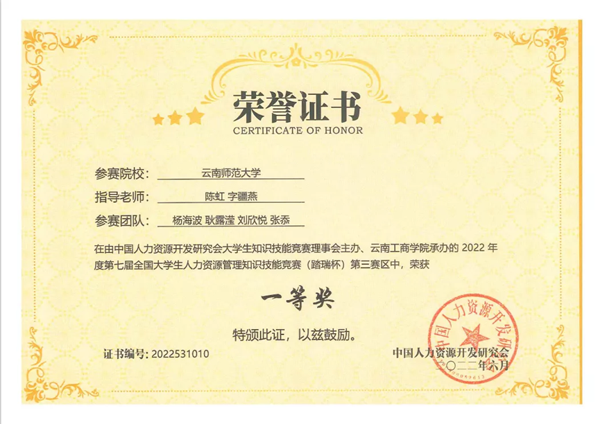 近日,第七届全国大学生人力资源管理知识技能竞赛(踏瑞杯)本科组西南赛区比赛在线上顺利进行,来自云南、贵州、四川和重庆的诸多高校参与比赛。云南师范大学教育学部本科生杨海波、张忝、耿露滢、刘欣悦四位同学组成队伍参赛,教育学部陈虹老师、字疆燕老师担任指导老师。