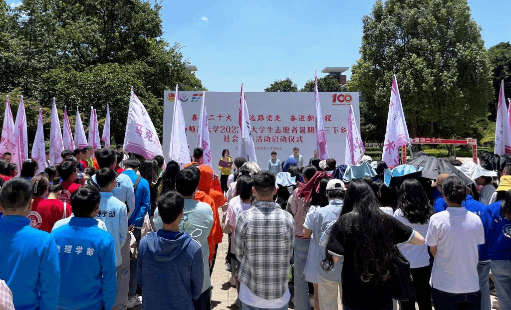 7月6日中午,云南师范大学2022年大学生志愿者暑期“三下乡”社会实践活动启动仪式在我校呈贡主校区红烛广场举行,校党委副书记李宏,校党委委员、副校长蔡金红,校团委全体人员,各学院(学部)团委书记,以及暑期社会实践立项小分队的指导教师和学生代表等参加活动。校团委副书记曹逸凡主持启动仪式。