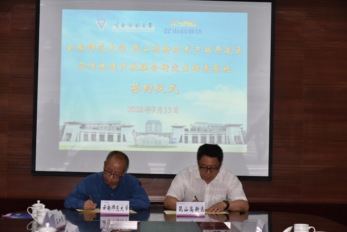 研究生院院长骆华松,昆山高新区管委会副主任沈跃新共同签署了《云南师范大学昆山高新技术产业开发区合作共建产教融合研究生培养基地协议》。全体参会人员合影留念。