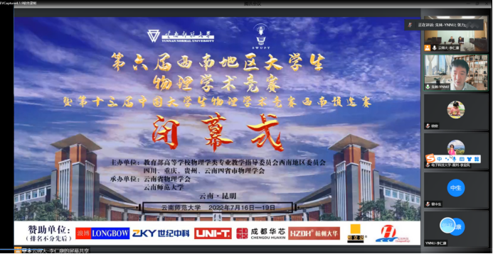 7月17日至18日,由教育部高等学校物理学类专业教学指导委员会西南地区分委会主办,云南省物理学会、云南师范大学物理与电子信息学院承办的“第六届西南地区大学生物理学术竞赛暨第十三届中国大学生物理学术竞赛西南预选赛”在我校举行。来自四川、重庆、云南及贵州四省的27所高校、46支队伍共计400余名选手参加此次竞赛。受疫情影响,比赛采用线上方式进行。