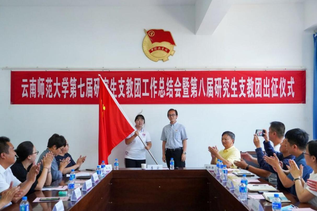 仪式上,校党委副书记李宏老师为第八届研支团授支教团团旗,校党委组织部副部长马春雨老师为第八届研支团授党旗,校团委副书记曹逸凡老师为第八届研支团授共青团团旗。