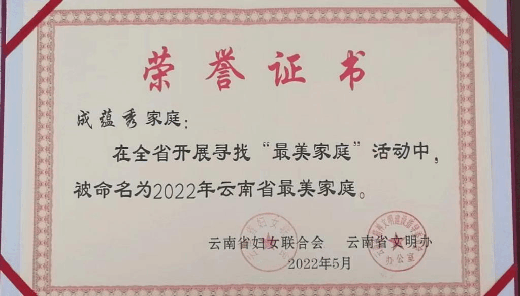 在2022年6月15日举办的“好家风传万家——2022年云南省最美家庭揭晓仪式暨家风好故事主题宣讲活动”上,省委宣传部、省妇联、省文明办共同揭晓100户云南省最美家庭。我校生命科学学院成蕴秀家庭入选2022年云南省“最美家庭”称号。