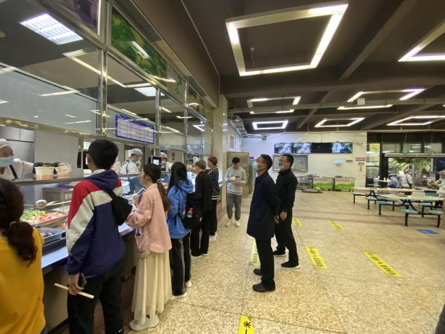 随后,王德强校长一行来到学生食堂,了解食堂饭菜供应与学生就餐情况,并与就餐同学亲切交谈,询问同学们所思所想,同学们畅所欲言,气氛温馨愉快。