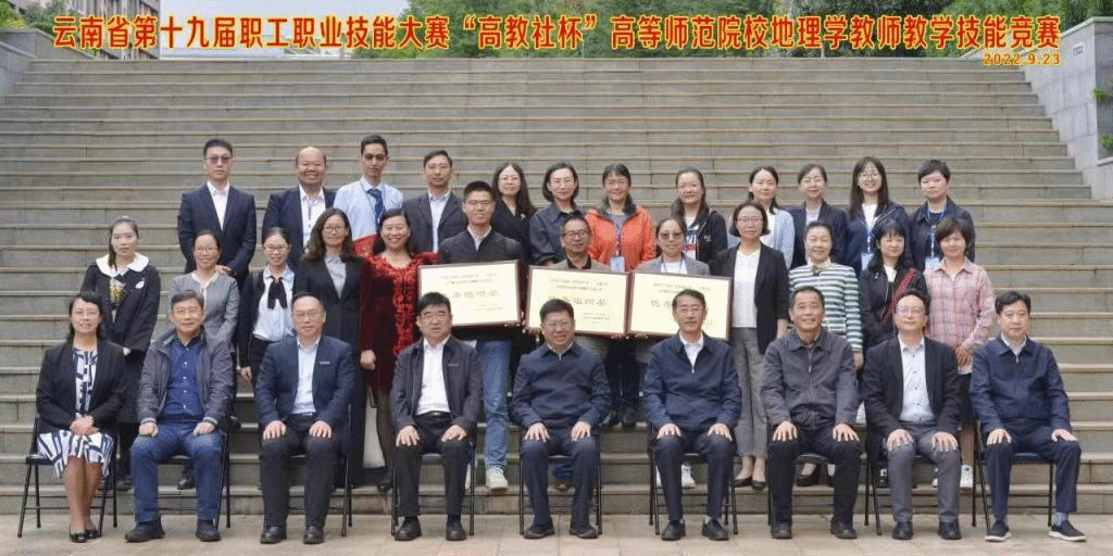 最后,云南省第十九届职工职业技能大赛——“高教社杯”高等师范院校地理学教师教学技能大赛领导嘉宾、评审专家与全体参赛选手合影留念。