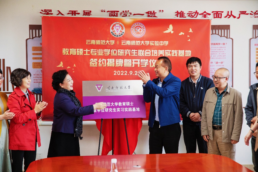 9月23日,云南师范大学与云南师范大学实验中学(以下简称实验中学)教育硕士专业学位研究生联合培养实践基地签约揭牌暨开学仪式在实验中学顺利举行。我校副校长安学斌、研究生院院长骆华松、各相关学院负责人、教育硕士实习生及相关人员,实验中学党委书记、校长李幼芹,党委副书记姜萍、副校长廖天迅及相关部门负责老师、骨干教师代表出席了仪式。仪式由研究生院院长骆华松主持。