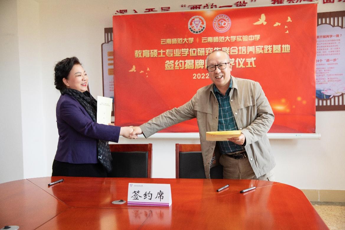 研究生院骆华松院长和实验中学李幼芹校长共同签署了《云南师范大学与云南师范大学实验中学共建教育硕士专业学位研究生联合培养实践基地协议》。
