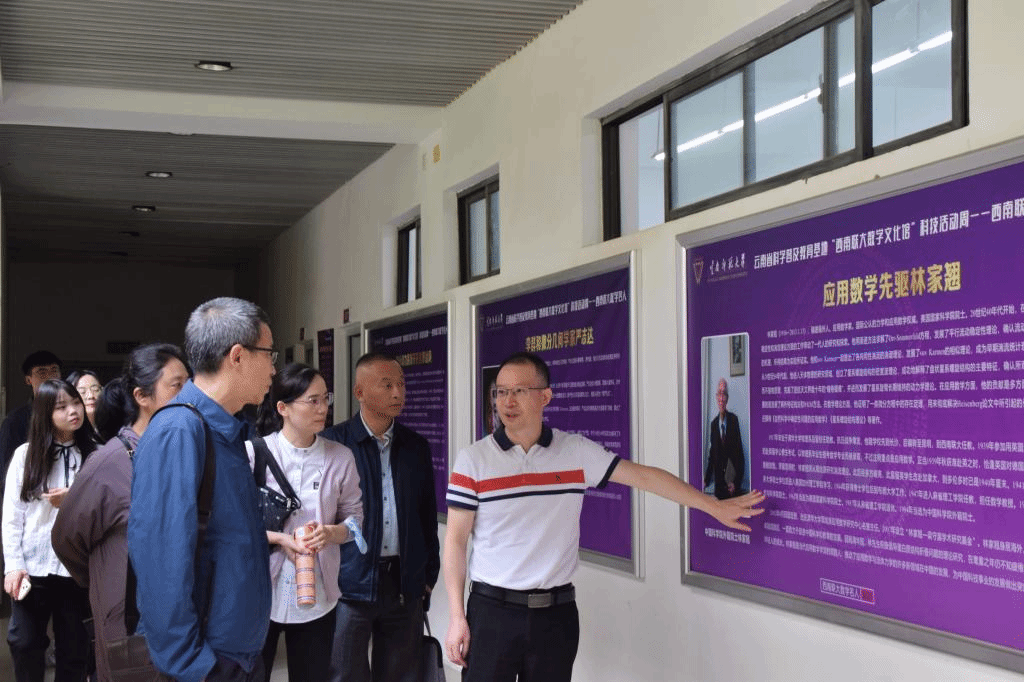 检查组组长尚朝秋,成员杨苏、王可心,我校科技处处长李明、副处长李灿松,在副院长刘祥清(主持工作)和科普基地负责人引导下先后实地参观了数学学院杨武之雕塑、院史馆、西南联大数学教授文化墙、资料室、西南联大数学名人文化墙、数学知识文化墙、科普展教室、智慧教室、动态几何软件展教室等科普场馆和设施。检查组体验了数学科普活动,对科普基地有了充分认识,对我校科普工作开展情况表示充分肯定。