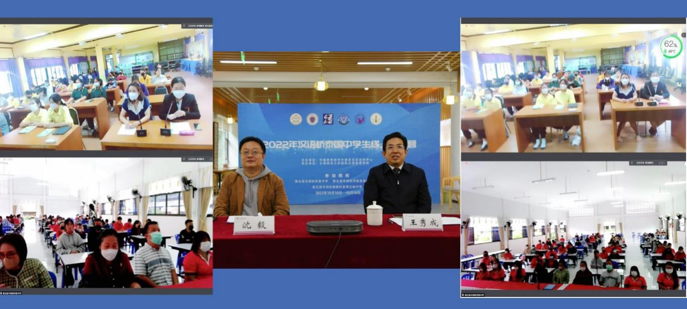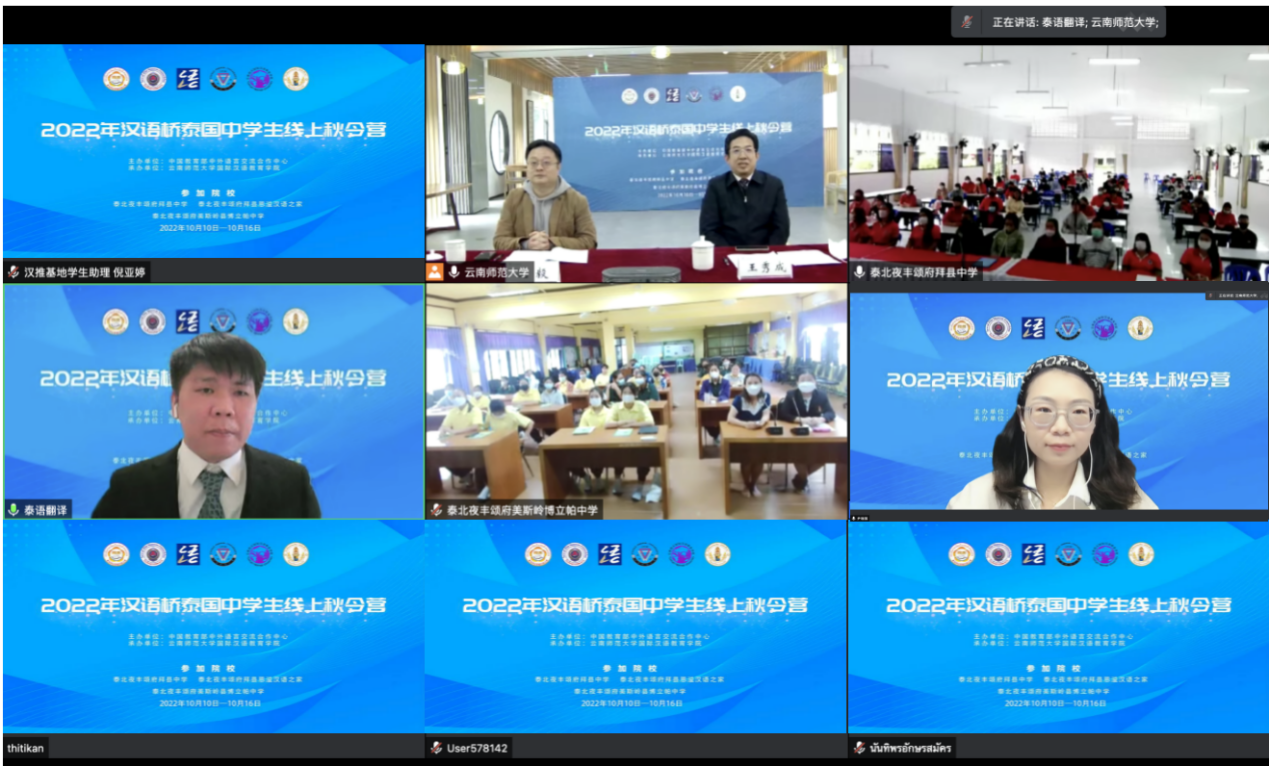 10月10日,2022年“汉语桥”泰国中学生线上秋令营正式开营。本次活动由教育部中外语言交流合作中心主办,云南师范大学国际汉语教育学院承办。共有130名来自泰北夜丰颂府拜县中学、恩溢汉语之家、美斯岭县博立帕中学的中学生参加。开营仪式在国际汉语教育学院文化活动室现场直播。国际汉语教育学院院长王秀成,拜县中学副校长金达,博立帕中学副校长甘佳娜,两所中学中文教师代表,汉语国际推广师资培训基地(昆明)办公室工作人员,全体参训学员参加。仪式由基地(昆明)常务副主任沈毅主持。