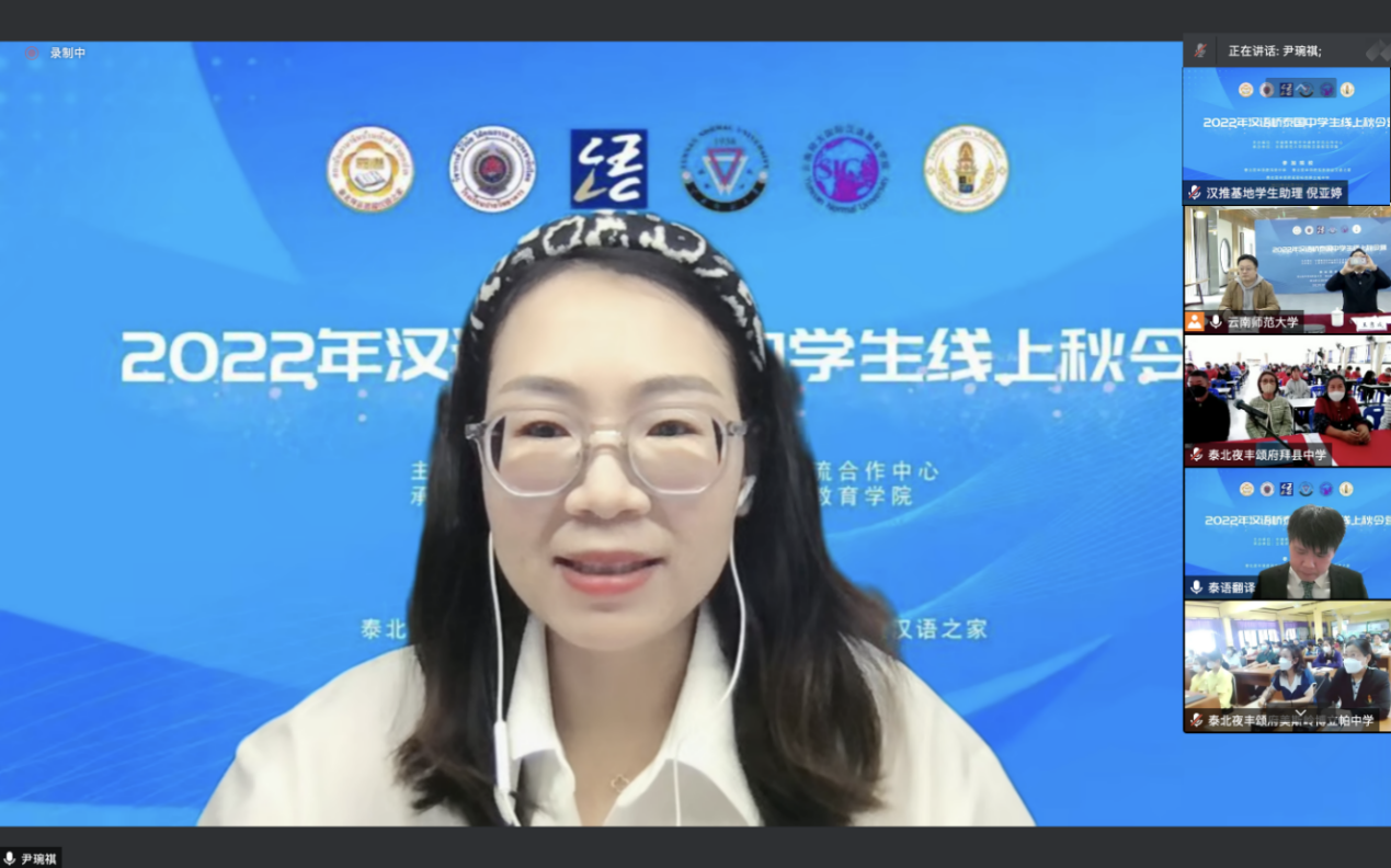 尹琬祺作为授课教师代表发言。她分享了一位因参加泰国中学生秋令营而爱上中文,最终成功申请云南省华裔学生奖(助)学金到云南师范大学留学的励志故事。她希望同学们享受这次学习之旅,学有所获,今后也能到中国学习、深造。