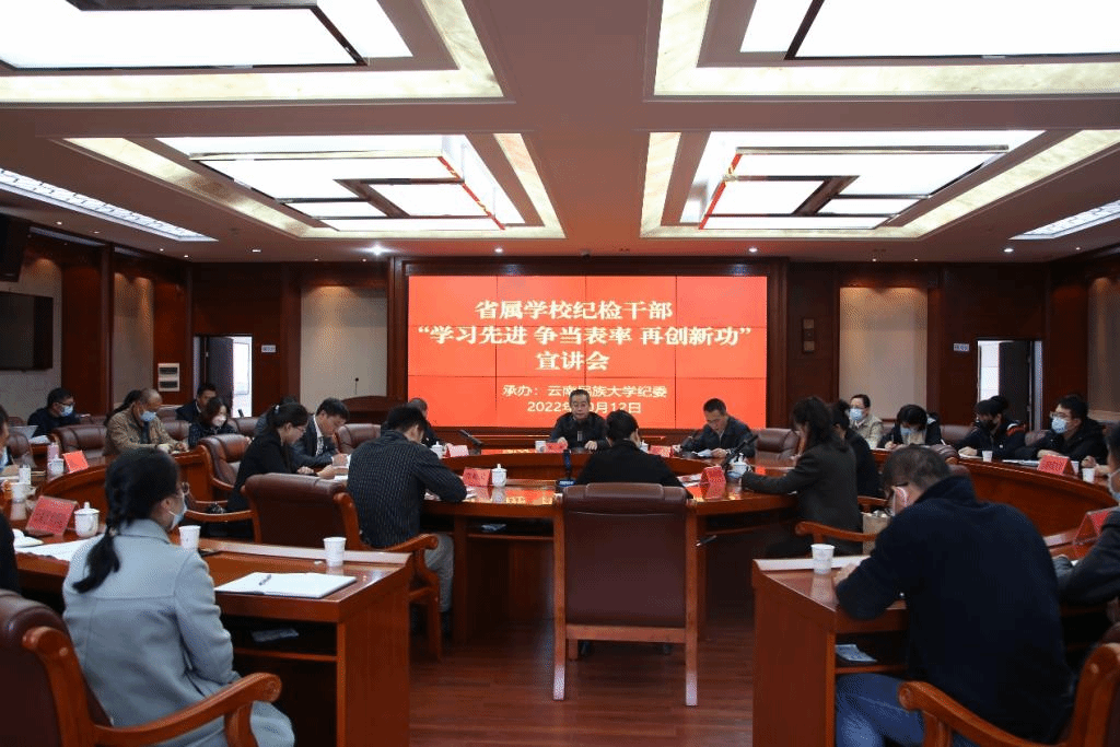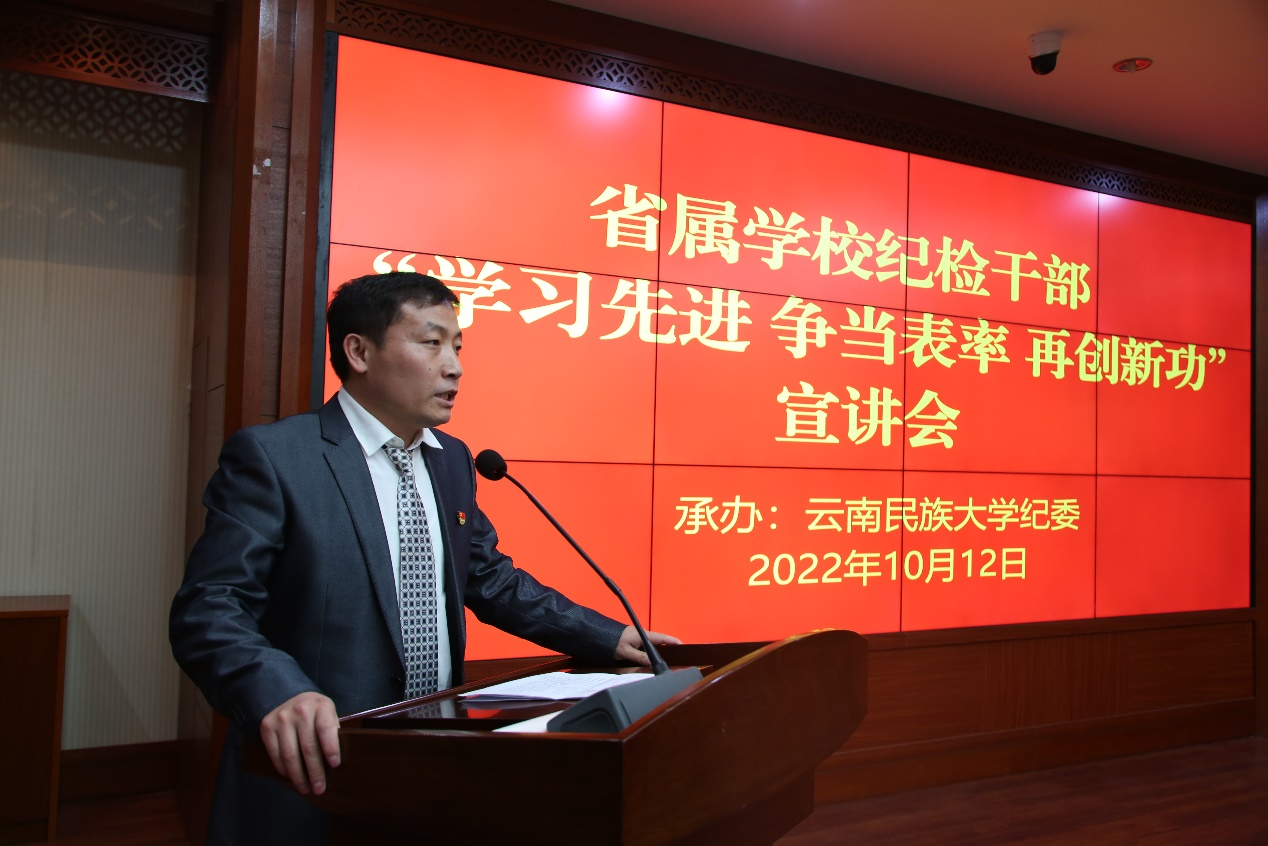 为深入学习贯彻习近平新时代中国特色社会主义思想,弘扬伟大建党精神和自我革命精神,发挥先进典型示范引领作用,积极营造崇尚先进、学习先进、争当先进的浓厚氛围,以实际行动迎接党的二十大胜利召开。10月12日,省属学校纪检干部“学习先进 争当表率 再创新功”宣讲会在云南民族大学举行,校纪委组织我校纪检干部代表参加。