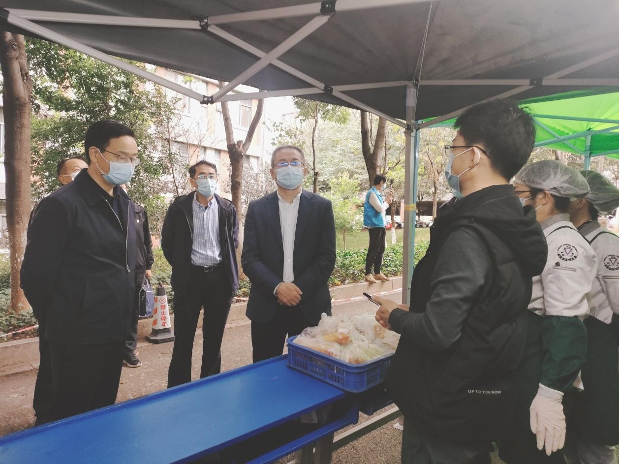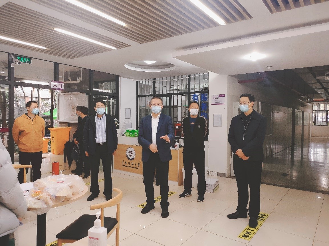 在东区学生宿舍7栋,张祖武、王德强向工作人员细致了解学生健康监测、餐饮供应状况,强调要及时回应学生关切,认真细致做好后勤保障,确保学生正常的学习生活秩序。