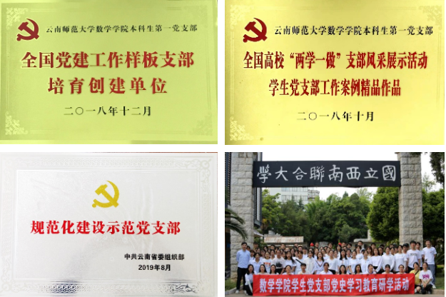 数学学院党委坚持把学习贯彻习近平新时代中国特色社会主义思想作为首要政治任务,认真学习贯彻习近平总书记关于教育的重要论述和考察云南重要讲话精神、考察西南联大旧址重要指示精神,自觉在思想上、政治上、行动上同以习近平同志为核心的党中央保持高度一致。充分利用党委理论学习中心组学习、教职工政治理论学习、党员组织生活等活动开展思想政治建设。抓实基层党建“推进年”“提升年”“巩固年”“创新提质年”“智慧党建三年行动计划”,严格落实“三会一课”、主题党日、党员积分、“政治生日”“党费日”等制度。以“两学一做”学习教育、“不忘初心、牢记使命”主题教育、党史学习教育为契机,抓一流党建创建,推动支部规范化达标建设,落实学校年度党建重点工作任务。制定“‘挂包帮、转走访’帮扶贫困户计划书”,到村到户开展扶贫工作。选派教师担任驻村工作队员,选派教师到怒江州民族中学担任校长,助力怒江州教育精准扶贫。扎实开展党史学习教育,积极开展“我为群众办实事”实践活动。认真落实发展党员步骤要求,规范党员发展和管理。重视教育培训,每年入党积极分子培训、发展对象培训各至少2期,“万名党员进党校”培训每年覆盖率达100%,支部规范化达标率达100%,党务信息化和智慧党建工作稳步推进。