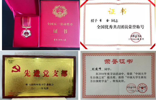 学院1个党支部被评为云南师范大学“先进党支部”,2个党支部被选树为云南师范大学“创建一流党建示范党支部”,2个项目被选树为云南师范大学“创建一流党建示范项目”。研究生第二党支部2021年荣获云南省第三批“一流党建”示范项目的示范党支部称号,并推荐参加第三批全国高校党建示范建设和质量创优工作遴选;学院工会连续三年获得学校工会考核一等奖,学院团委获评学校“五四红旗团委”,学生会获评云南师范大学“优秀学生会”;教师党员张无敌入选“2020年全国教书育人楷模”候选人。辅导员何雁敏2019年获得云南省第九届高校辅导员素质能力大赛冠军,并于2021年获评“全国五一劳动奖章”。研究生党员李金2021年获评“全国优秀共青团员”和云南省第三批“一流党建”示范项目的研究生党员标兵,研究生党员刘健峰、李金获评“中国大学生自强之星”,研究生党员曾锦获评“云南省优秀共青团员”,研究生党员付洪凯推荐参评云南省第四批高校创建一流党建示范党组织的研究生党员标兵,本科生党员杨馨语获评云南师范大学“十佳大学生”。