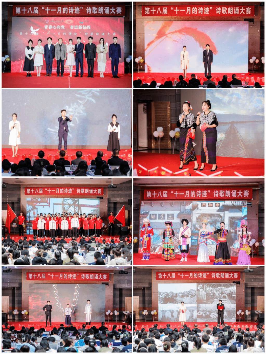 为深入学习宣传贯彻党的二十大精神,引导青年大学生用青春的能动性和创造力激荡起民族复兴的澎湃新潮,奋进新征程、建功新时代,11月10日下午,由学生处主办、易班学生工作站承办的“青春心向党 奋进新征程”第十八届“十一月的诗迹”诗歌朗诵大赛决赛在我校呈贡校区汇文楼三区105报告厅举行。校党委副书记李宏、副校长陈正权,学生处处长张国华到比赛现场观赛和指导。本次比赛由文学院教授骆锦芳,就业处创新创业学院办公室副主任白宇,教育部高校思想政治工作队伍培训研修中心、学生中心副主任段剑金,校团委宣传部部长曹威,传媒学院谭辉担任评委。比赛采用线上线下相结合的方式呈现,全校20个学院(学部)的易班工作站指导教师和学生代表共500余人参与线下观赛,线上直播点击量达37600余人次。