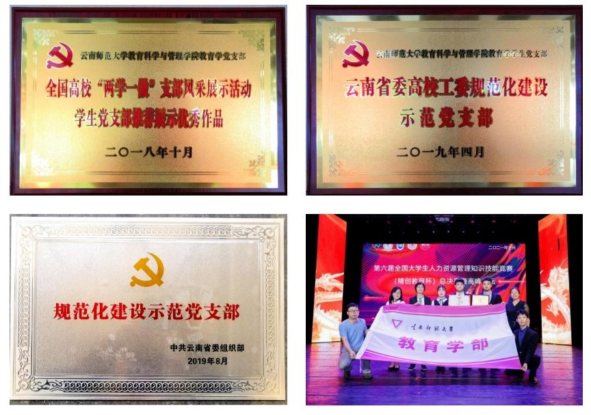 党建和思想政治工作成效显著。一是党团组织建设取得新突破。学部入选教育部首批“三全育人”综合改革试点院系全国50强试点单位。教育学党支部《构建“学·做·创”三维学习模式》入选全国“两学一做”优秀案例,并被评为云南省委组织部、云南省委教育工委规范化达标示范党支部、云南省委高校工委创一流示范党支部。学部团委荣获“云南省五四红旗团委”荣誉称号,5个班级荣获“省级优秀班集体”称号,2个团支部获得共青团中央学校部授予的“活力团支部”荣誉称号,西区2-411宿舍在寻访“中国大学生百炼之星”活动中获得“中国大学生百炼之星”的称号。二是思想政治工作队伍能力显著提升。学部辅导员先后荣获第十二届全国“高校辅导员年度人物”提名奖、第七届全国高校辅导员素质能力大赛二等奖,获云南省“2020年最美高校辅导员”称号,在云南省第九届辅导员素质能力大赛获二等奖2人次,在第五届云南省高校心理健康教育教师职业能力大赛获一等奖。获批教育部人文社科辅导员专项1项,云南省哲学社会科学教育单列(思政项目)1项,校级项目8项,《以案示法——辅导员心理个案工作的基本功》获全国高校思政网2021年度高校辅导员网络培训课程建设立项。三是学生综合素质有效增强。学生制作的手语舞《唱支山歌给党听》在新华网播放点击量超过85万。学生在全国第六届大学生人力资源管理知识技能大赛中获全国一等奖,在“互联网+创新创业大赛”中获国家级铜奖1项、省级金奖1项、银奖2项、铜奖3项,在全国第二届大学生心理辅导课程教学创新展示会上获二等奖。学生社会实践成果喜人,“青声理论宣讲团”入选团中央千支大学生理论宣讲团,“筑梦未来”志愿服务队入选团中央2022年“七彩假期”志愿服务示范团队,2022年暑期社会实践调研报告《西部“幼有所养 老有所伴”关爱混合模式调研报告》入选团中央社会实践优秀调研报告。