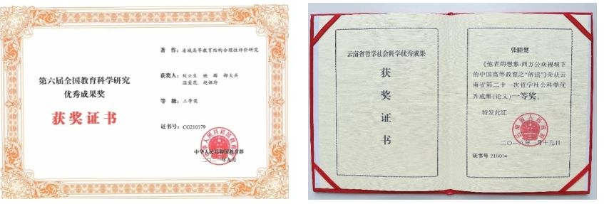 教学科研成果不断涌现。2016年以来学部教师主持国家社科项目13项、国家自科项目10项、全国教育科学规划项目5项、教育部人文社科项目4项、省哲社24项、省教育科学规划11项、政府部门委托项目7项;出版著作31部,其中A类出版社24部,B类出版社7部;发表高水平学术论文154篇,其中CSSCI共137篇,SSCI共8篇,SCI共9篇;获高层次奖44项,包括第六届全国教育科学研究优秀成果奖三等奖、全国第五届教育硕士优秀教师奖、云南省第八届高等学校教学成果一等奖、云南省哲学社会科学优秀成果一等奖、云南省科学技术进步奖创新团队类三等奖、首届全国教育专业学位案例教学大赛特等奖、云南省基础教育教学成果奖二等奖等。