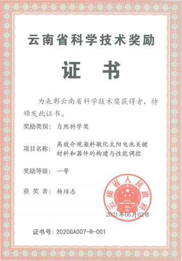 可再生能源材料先进技术与制备教育部重点实验室“高效介观染料敏化太阳电池关键材料和器件的构建与性能调控”成果获得2020年度云南省自然科学奖一等奖