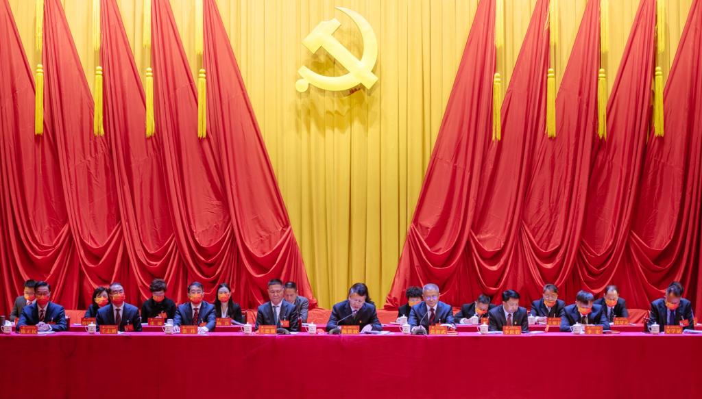 大会会场庄严隆重,气氛热烈。主席台上方悬挂着“中国共产党云南师范大学第十三次党员代表大会”会标,后幕正中是镰刀和锤头组成的党徽,10面鲜艳的红旗分列两侧。眺台上方悬挂着“牢记嘱托 团结奋斗 不负荣光 加快建设西部领先、辐射南亚东南亚的高水平师范大学”的横幅。
