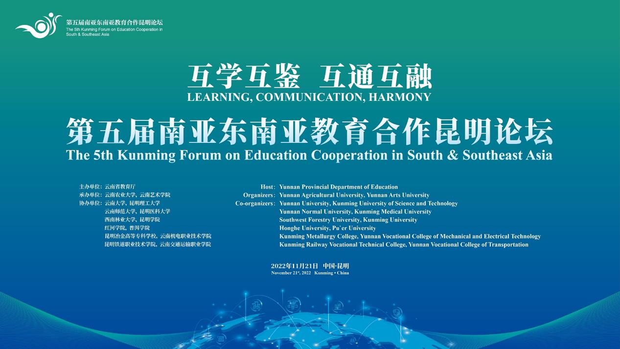 11月21日,第五届南亚东南亚教育合作昆明论坛在昆明滇池国际会展中心举行。来自13个南亚东南亚国家教育部门和高校的200余位专家学者通过线上或线下方式,围绕“互学互鉴,互通互融”主题,就教育国际交流合作的新方向、新模式以及如何推进云南省教育高水平对外开放等问题开展交流研讨。我校副校长郝淑美,对外合作交流处副处长李艳等参加了此次论坛开幕式及相关活动。
